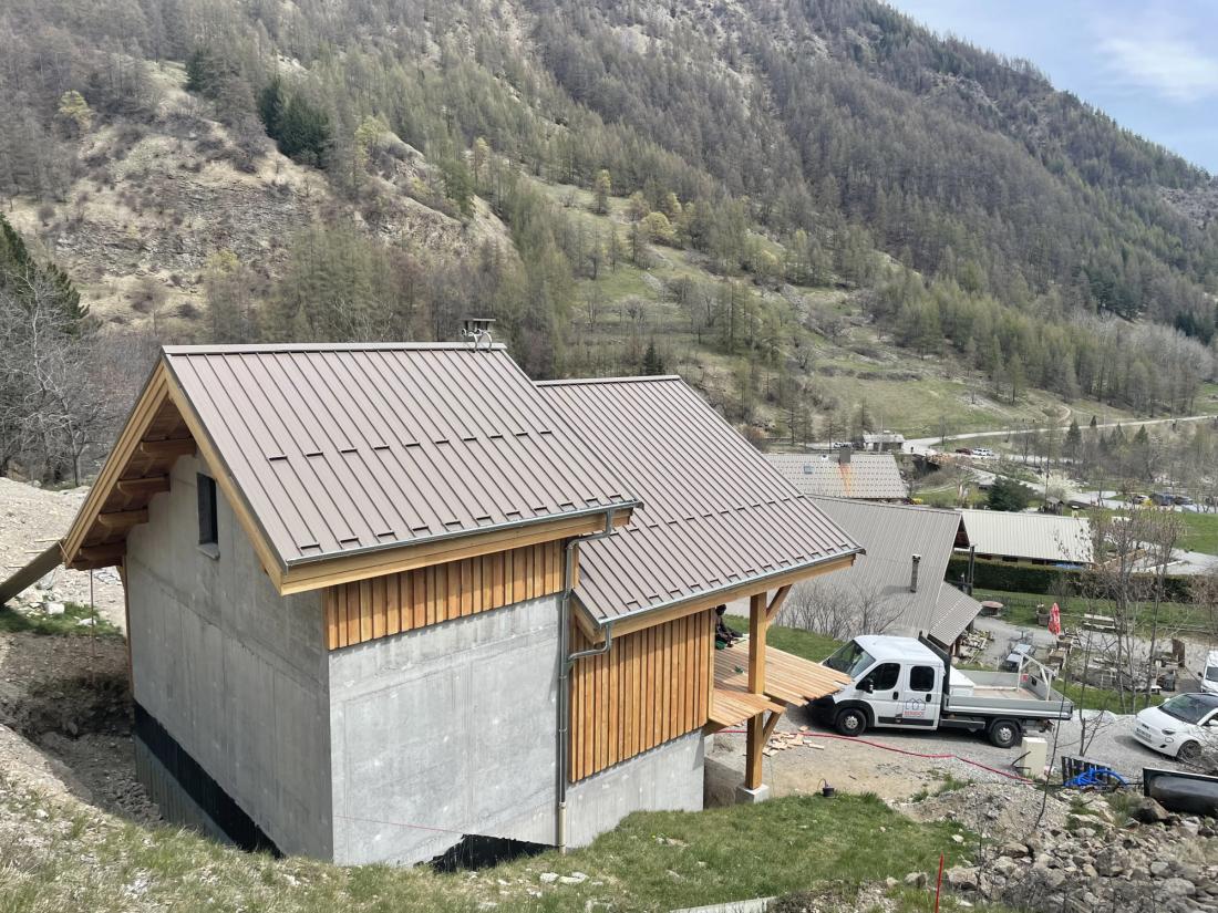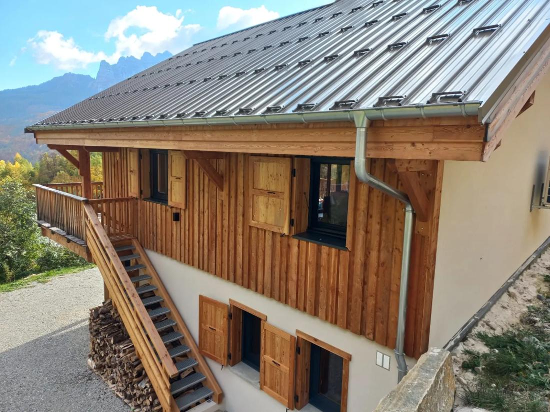 La structure et le bardage ont été réalisés en mélèze, avec un bardage en planches brutes de sciage, apportant au chalet un charme rustique et naturel, fidèle à l’architecture de montagne. La couverture a été réalisée en bac acier, offrant une solution à la fois durable, performante et adaptée aux contraintes climatiques alpines.